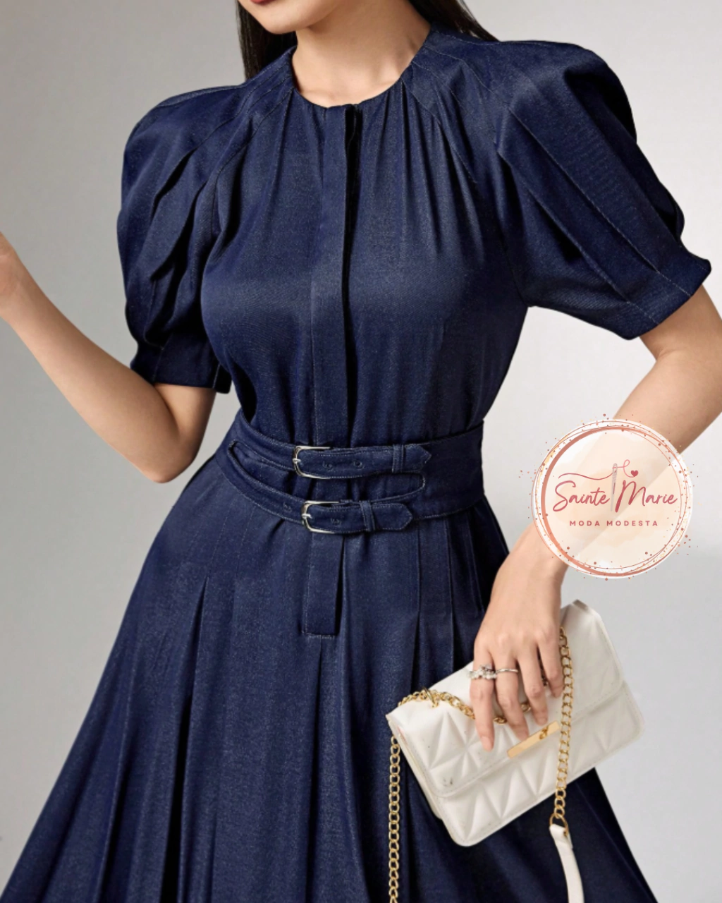 Há vestes que comunicam equilíbrio: a firmeza de quem sabe seu caminho e a suavidade de quem o trilha com graça. O Vestido Governança Marinho foi selecionado pela Sainte Marie por sua silhueta arquitetônica. Com mangas que evocam nobreza e um caimento que honra a discrição, esta peça é o uniforme perfeito para a mulher que exerce liderança em seu lar, na educação ou em sua comunidade.